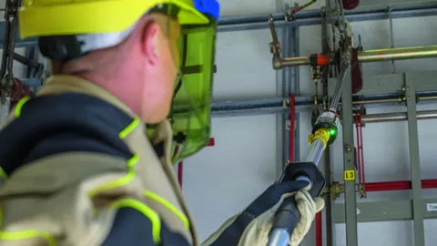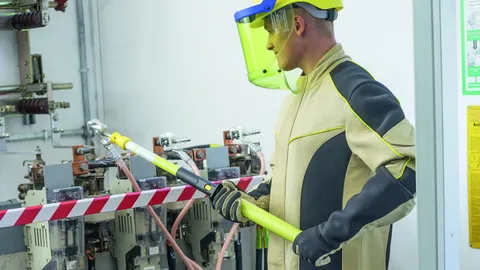 Equipos de seguridad como p. ej. pértigas de maniobra, elementos de bloqueo, detectores de tensión, equipos de puesta a tierra y cortocircuito y placas protectoras aislantes para los trabajos según las cinco reglas de seguridad
