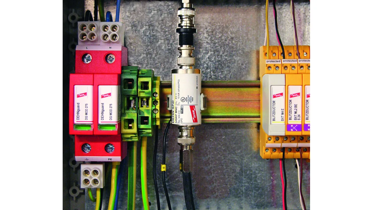 Two-stage surge arrester with indirect shield earthing for protecting video cameras and Arcnet with BNC connection to avoid ground loops.