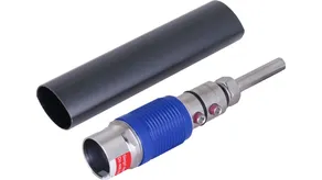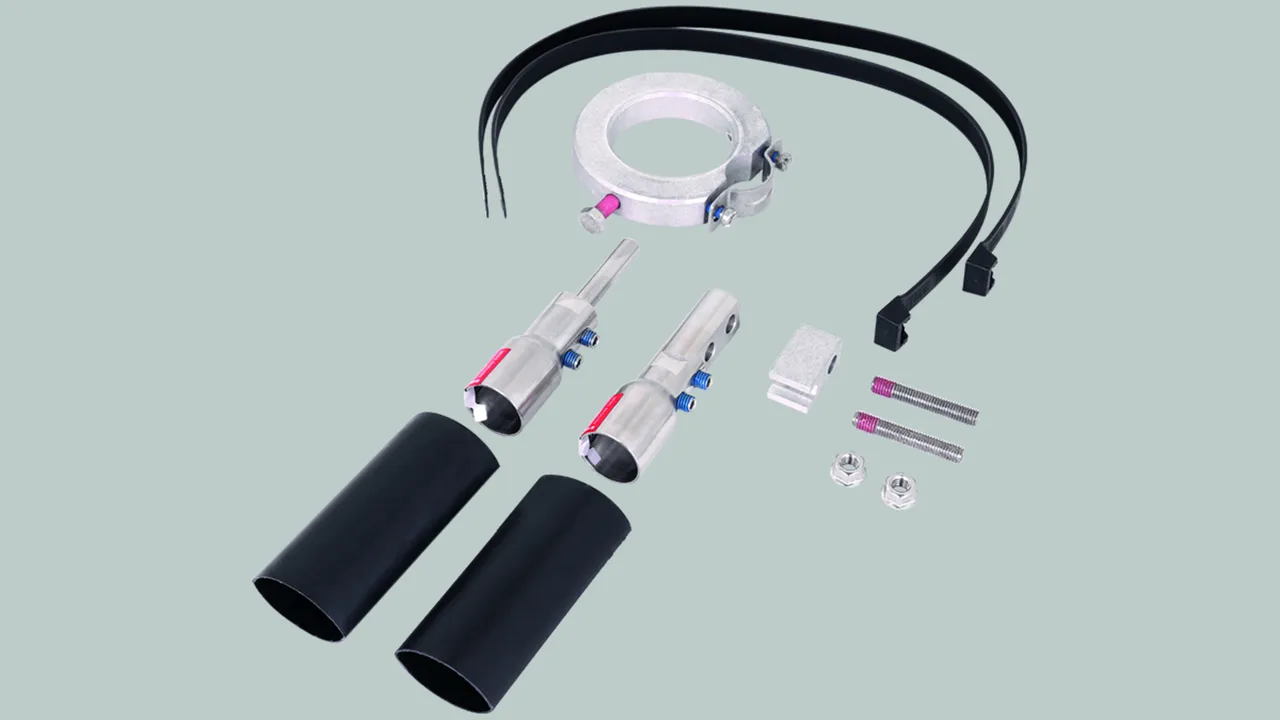 Anschlussset für HVI power Leitung zur Verlegung an HVI power Stützrohren GFK / Al bestehend aus Anschlusselemente, Gewindestifte, Anschlussteil, Schrumpfschlauch, Kabelbinder und Befestigungsring mit einem geschlitzten Leitungshalter (Ø27 mm).