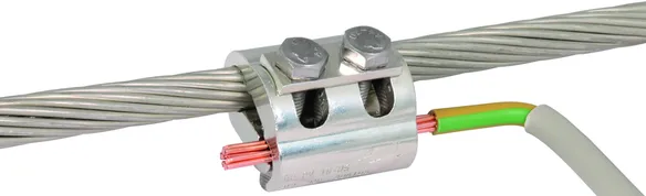 Parallel connector for establishing an equipotential bonding system in potentially explosive atmospheres. Tested for non-sparking use in potentially explosive atmospheres in Ex zone 1 and 2 (gases of explosion group IIC) and Ex zone 21 and 22 (dust). Small version for different cable diameters, with spring washer and two screws which are secured against working loose according to Supplement 2 of DIN EN 62305-3.