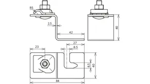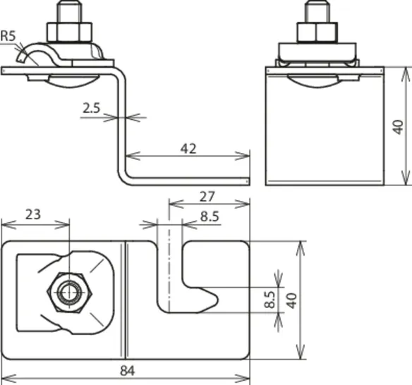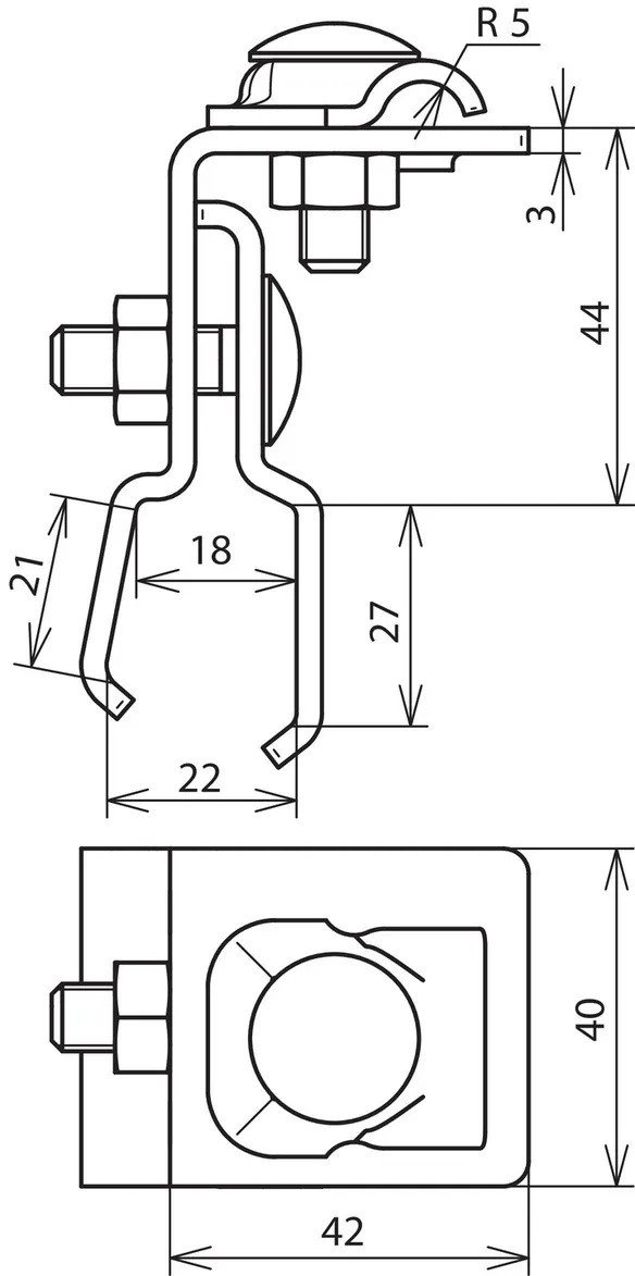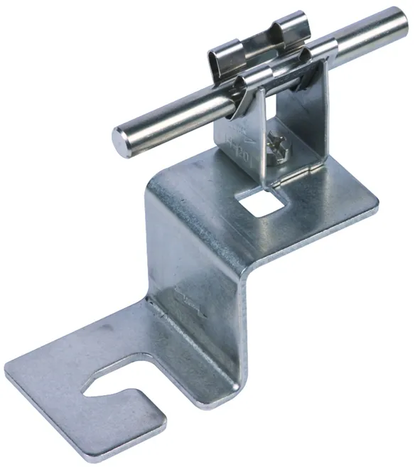 Roof conductor holder for metal roofs for fixing additional air-termination systems or conductors on metal roofs (e.g. Part No. 123 021).