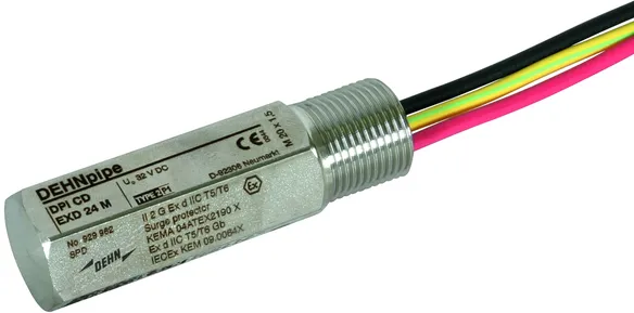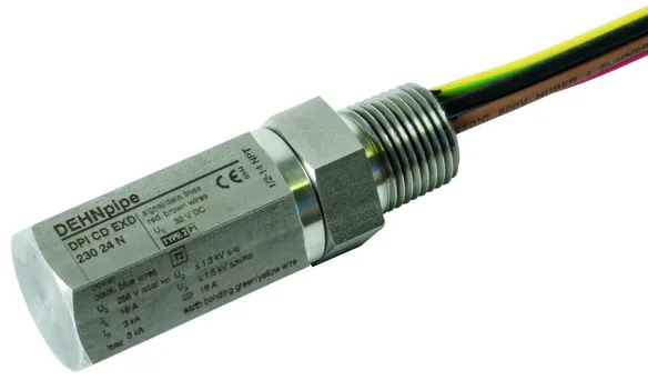 Flameproof surge arrester for the data and power side for protecting one 120 / 230 V power supply system and one 24 V data interface of field devices in potentially explosive areas (zones 1 and 2).