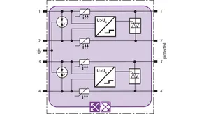 Space-saving combined lightning current and surge arrester module with actiVsense technology and RFID LifeCheck for protecting two pairs (same or different operating voltage) of balanced interfaces with galvanic isolation. Automatically detects the operating voltage of the useful signal and optimally adapts the voltage protection level to it.