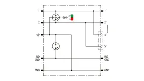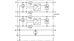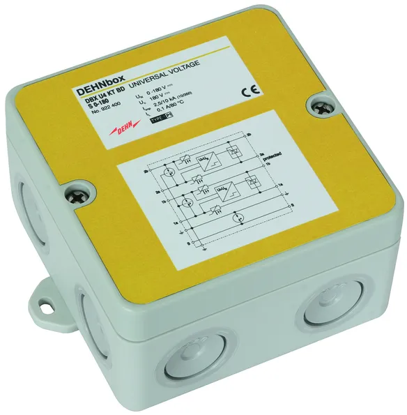 Compact combined lightning current and surge arrester in a surface-mounted plastic enclosure with actiVsense technology for protecting two pairs with the same or a different signal voltage of galvanically isolated balanced interfaces. Direct or indirect shield earthing.