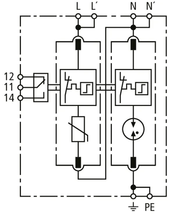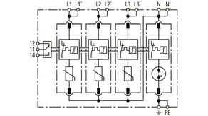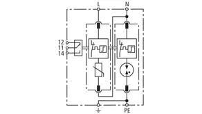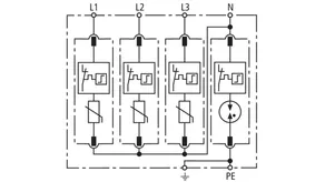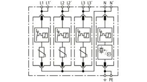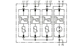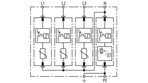 Modular surge arrester with a high total discharge capacity in the N-PE path for TT and TN systems (1+1 configuration); meets increased safety requirements by higher discharge capability; with floating remote signalling contact.