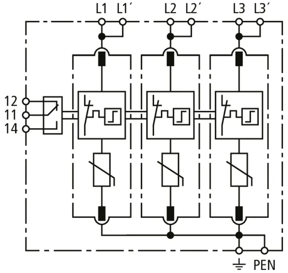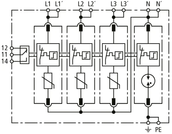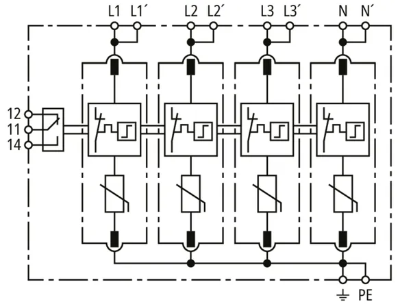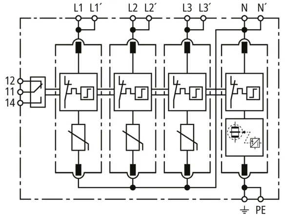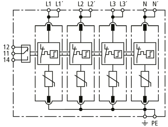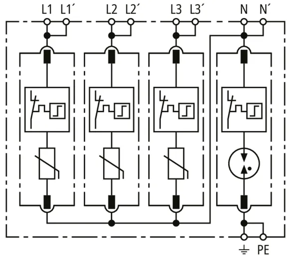 Modular surge arrester for use in TN-S systems (4+0 configuration); with floating remote signalling contact.