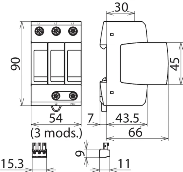 SPD according to EN 61643-11 / IEC 61643-11 Type 2 + Type 3 / class II + class III