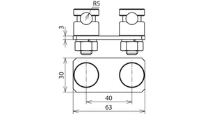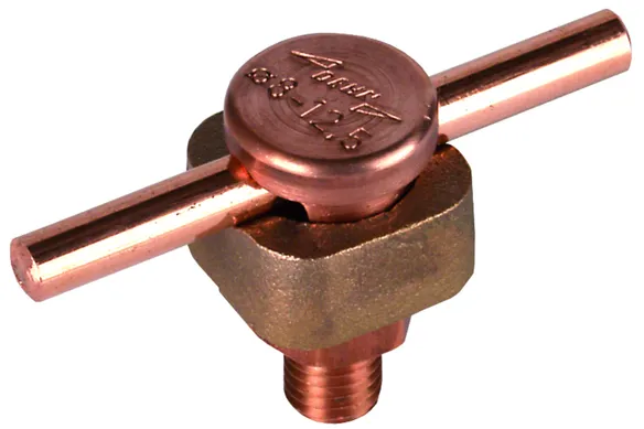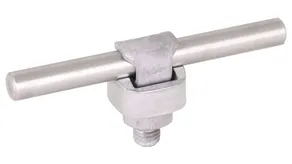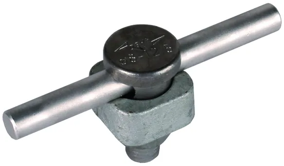 Clamping screw connector (KlemmSchrauben-Verbinder) for lightning current carrying connection of round conductors, e.g. to flat profiles, downpipe clamps or other parts of the lightning protection system.