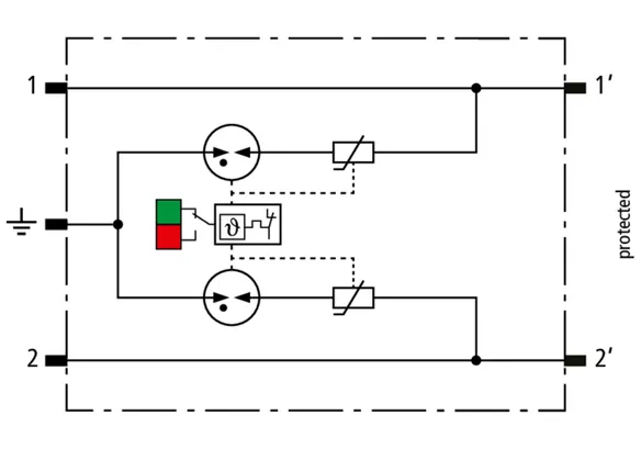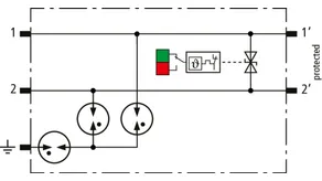 Space-saving, modular lightning current arrester with a width of 6 mm and push-in connection technology with status indication for protecting two single lines for lightning equipotential bonding as well as indirect earthing of shielded cables. With signal disconnection for maintenance purposes.