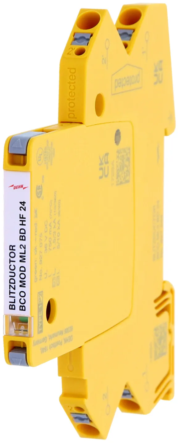 Combined arrester protection module with a width of 6 mm for BLITZDUCTORconnect with status indication for protecting one pair in 24 V DC systems. Also suitable for use with an earthed negative pole. Integrated PTC resistors allow for secure resetting of the arrester after interference in the system circuit with short-circuit currents of up to 40 A.