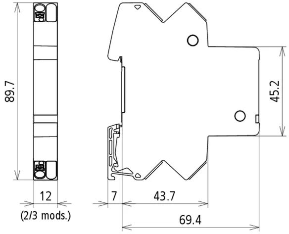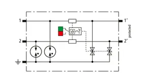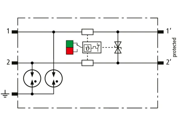 Space-saving, compact surge arrester with a width of 6 mm and push-in connection technology with status indication. Finely limiting, single-stage surge protection with powerful diodes for protecting two single cores sharing a common reference potential as well as unbalanced interfaces.