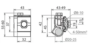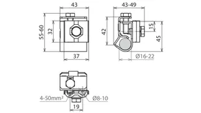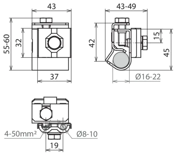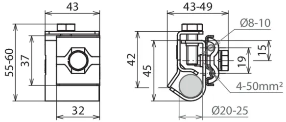 1 conductor Rd Ø10 mm or 1-2 conductors Rd Ø6-8 mm or 4-50 mm2 (solid / stranded).