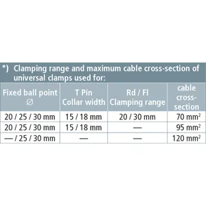 | *) See table for „Clamping range and maximum cable cross-section of universal clamps used for" | |